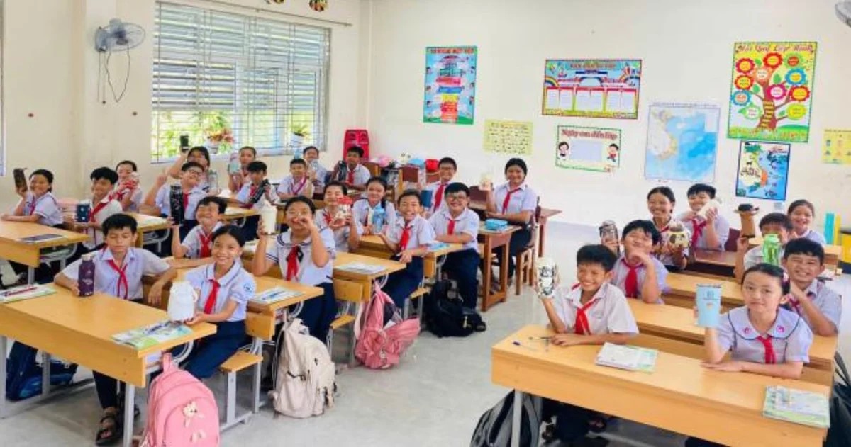 100% học sinh trường Tiểu học Cao Văn Ngọc sử dụng bình đựng nước thay cho chai, ly nhựa để giảm thải rác ra môi trường.
