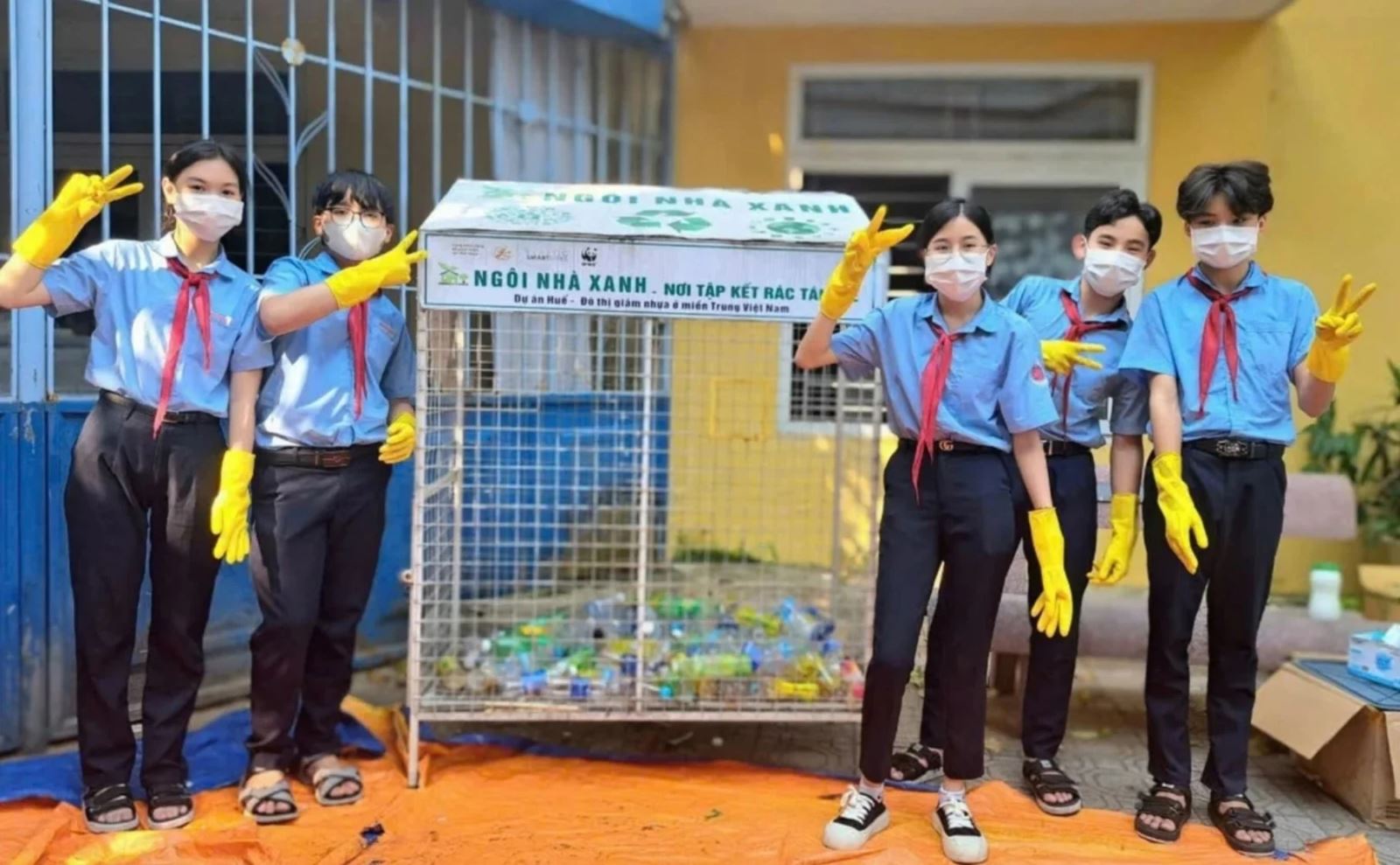 Học sinh Trường THCS Nguyễn Chí Diểu (đường Đống Đa, TP Huế) tham gia phân loại rác thải nhựa tại trường với mô hình "Ngôi nhà xanh".