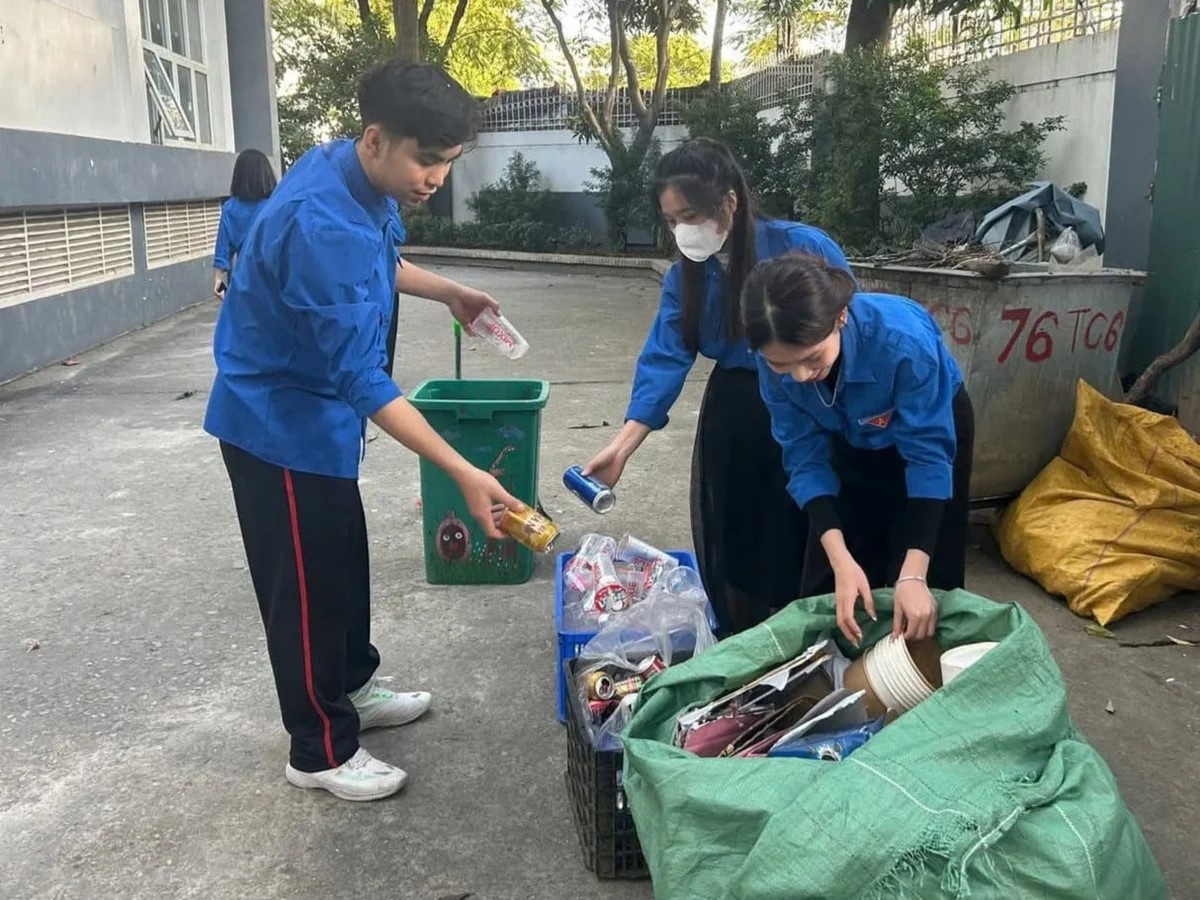 Học sinh tham gia phân loại rác thải tại trường THCS Trương Công Giai (Hà Nội).