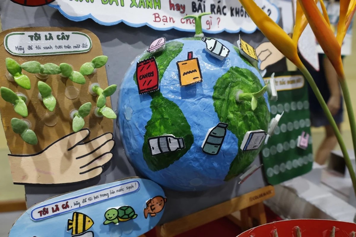 Tác phẩm với chủ đề môi trường được học sinh làm từ chất liệu đã qua sử dụng.