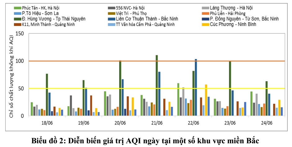 Theo kết quả tính toán chỉ số AQI ngày cũng cho thấy, chất lượng không khí khu vực miền Bắc từ ngày 18/6 đến ngày 24/6 ở phần lớn các Trạm đạt ở mức trung bình đến mức tốt, ngoại trừ tại Trạm quan đường Hùng Vương - Tp.Thái Nguyên (21/6) và tại Trạm Từ Sơn - Bắc Ninh (22/6) chất lượng không khí ở mức kém (AQI dao động từ 100-150).