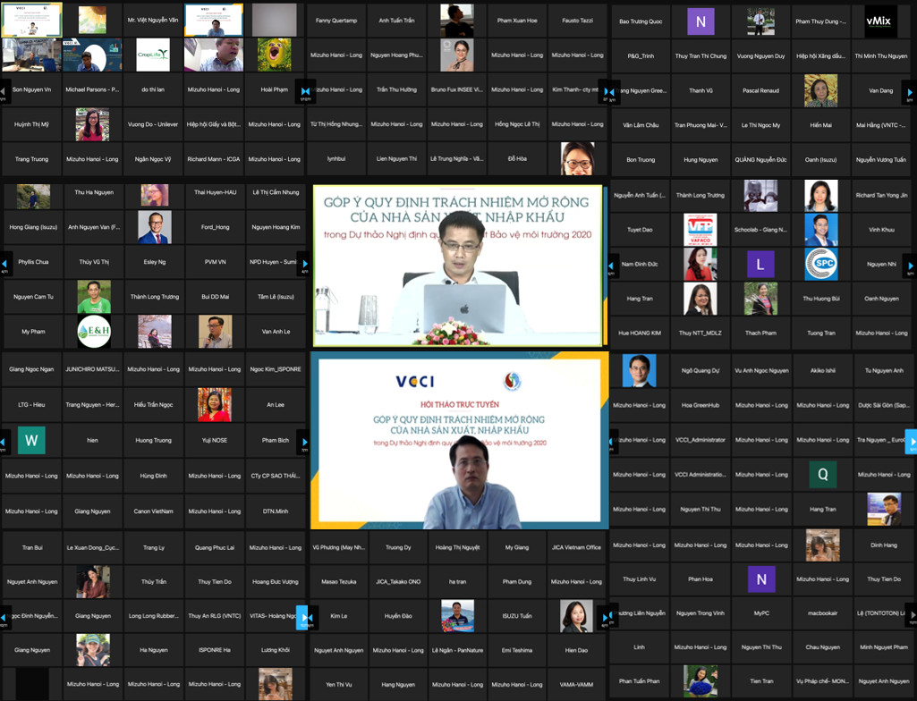 Ông Phan Tuấn Hùng, Vụ trưởng Vụ Pháp chế- Bộ TN&MT và ông Đậu Anh Tuấn Trưởng Ban Pháp chế- VCCI đồng chủ trì hội thảo; tham dự Hội thảo trực tuyến có đại diện 300 doanh nghiệp, hiệp hội doanh nghiệp, các tổ chức quốc tế, các chuyên gia trong và ngoài nước; trong đó có sự tham gia đầy đủ của các ngành hàng chịu tác động trực tiếp của Nghị định gồm: ngành hàng điện-điện tử; pin-ắc-quy; dầu nhớt; săm lốp; phương tiện giao thông; bao bì; thuốc bảo vệ thực vật; kẹo cao su; tã bỉm; thuốc lá; nhựa dùng một lần.