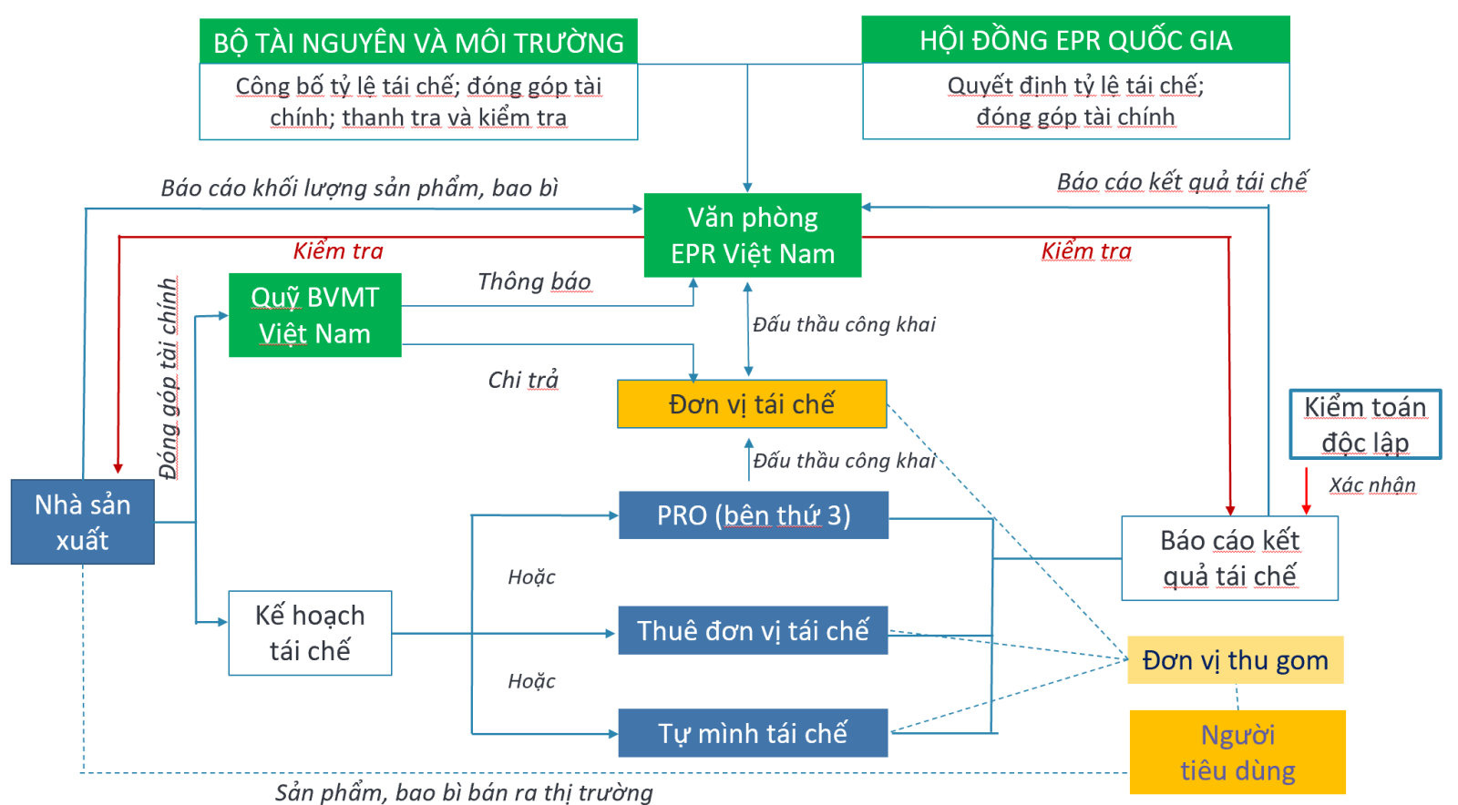 Nhà sản xuất, nhà nhập khẩu được lựa chọn một trong 2 hình thức sau để tái chế: (1) tổ chức tái chế hoặc (2) đóng góp vào Quỹ Bảo vệ môi trường Việt Nam (theo quy định tại khoản 2 Điều 54 Luật bảo vệ môi trường). Đối với hình thức tổ chức tái chế, dự thảo Nghị định quy định chi tiết thành 3 hình thức gồm (i) tự tái chế; (ii) thuê đơn vị tái chế; (iii) ủy quyền cho bên thứ 3 để tổ chức tái chế; đồng thời cũng quy định điều kiện để lựa chọn và thực hiện theo các hình thức nêu trên. Dự thảo Nghị định quy định về cơ chế đăng ký, báo cáo thực hiện trách nhiệm tái chế, xử lý trong đó có sự kiểm toán của đơn vị kiểm toán độc lập nhằm bảo đảm tính trung thực của kết quả tái chế. Để tổ chức vận hành hệ thống EPR, dự thảo Nghị định thiết kế Hội đồng EPR Quốc gia với các thành viên là các nhà quản lý, đại diện các nhóm ngành hàng và các chuyên gia môi trường; giúp việc cho Hội đồng có Văn phòng EPR Việt Nam, Văn phòng EPR Việt Nam là tổ chức của doanh nghiệp, do Bộ TNMT quy định chức năng, nhiệm vụ, quyền hạn và cơ cấu tổ chức theo đề nghị của Hội đồng EPR Quốc gia. Mô hình thực hiện tái chế, xử lý của nhà sản xuất, nhập khẩu như sau: