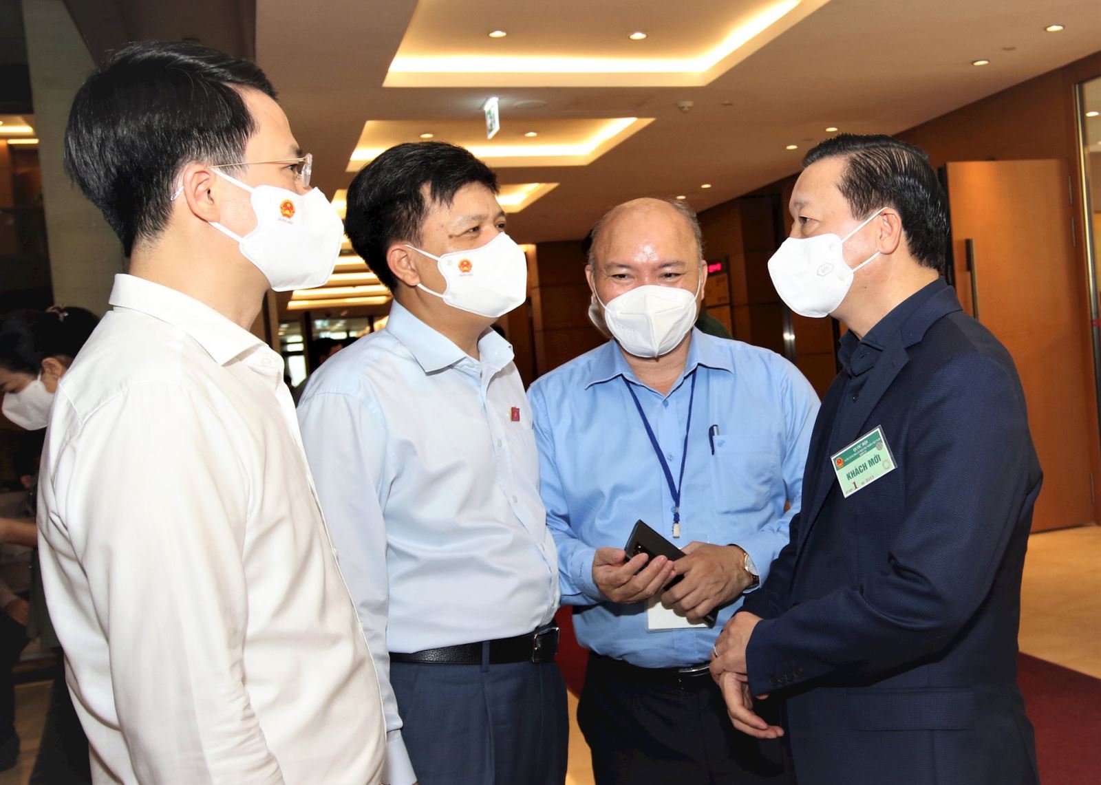 | Bộ trưởng Bộ TN&MT Trần Hồng Hà trao đổi với các đại biểu bên hành lang Quốc hội |
