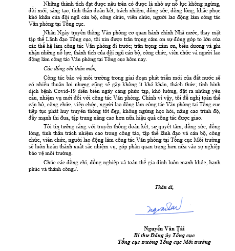 Nhân dịp kỷ niệm 76 năm Ngày truyền thống Văn phòng cơ quan hành chính Nhà nước (28/8/1945 - 28/8/2021), thay mặt Lãnh đạo Tổng cục Môi trường, Tổng cục trưởng Nguyễn Văn Tài đã gửi thư tới các cán bộ, công chức, viên chức, người lao động của Tổng cục với những tình cảm thân thiết và lời chúc mừng tốt đẹp nhất.
