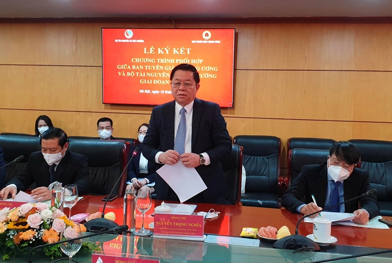 Để Chương trình ký kết được triển khai có hiệu quả, góp phần làm cho Nghị quyết Đại hội lần thứ XIII của Đảng đạt kết quả cao trong thực tiễn, Bí thư Trung ương Đảng, Trưởng Ban Tuyên giáo Trung ương Nguyễn Trọng Nghĩa đề nghị: Hai cơ quan cần xác định đây là nhiệm vụ chính trị quan trọng cần phối hợp để thường xuyên định hướng tư tưởng, chỉ đạo, phổ biến, quán triệt, tuyên truyền tới cán bộ, đảng viên và các tầng lớp Nhân dân về chủ trương, đường lối của Đảng, chính sách, pháp luật của Nhà nước trong quản lý, sử dụng hợp lý, hiệu quả, tiết kiệm các nguồn tài nguyên thiên nhiên, bảo vệ môi trường, ứng phó với biến đổi khí hậu; phòng, chống thiên tai.