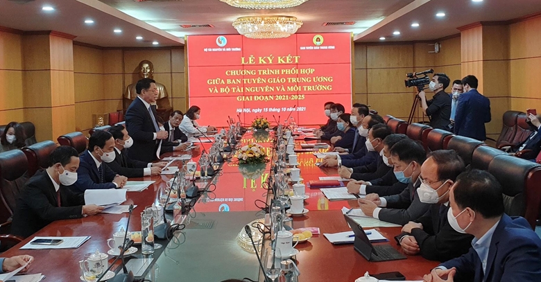 Sáng ngày 15/10, tại Hà Nội, Ban Tuyên giáo Trung ương và Bộ Tài nguyên và Môi trường (TN&MT) đã ký kết Chương trình phối hợp công tác giữa giai đoạn 2021 – 2025. Tham dự Lễ ký, về phía Ban Tuyên giáo Trung ương có Bí thư Trung ương Đảng, Trưởng Ban Tuyên giáo Trung ương Nguyễn Trọng Nghĩa; Ủy viên BCH Trung ương Đảng, Phó Trưởng ban Thường trực Ban Tuyên giáo Trung ương Lại Xuân Môn và một số cơ quan, đơn vị thuộc Ban Tuyên giáo Trung ương.