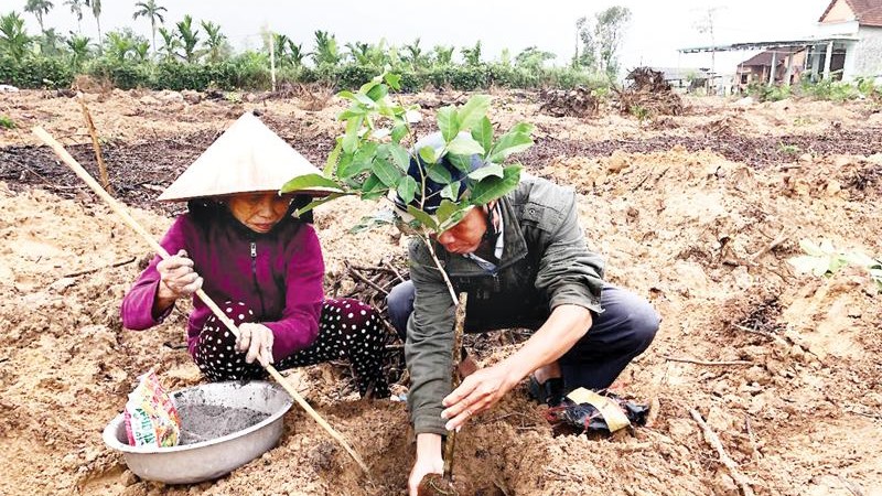 Người dân xã Hành Nhân (Nghĩa Hành) sử dụng phân bón được xử lý từ rác thải hữu cơ để bón lót cho cây ăn quả