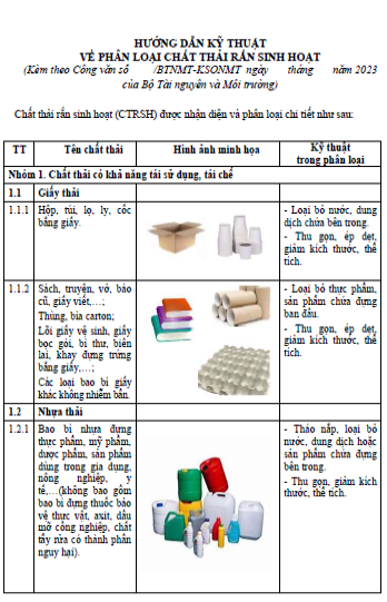 Để tiếp tục hướng dẫn Ủy ban nhân dân các tỉnh, thành phố trực thuộc trung ương triển khai hoạt động phân loại chất thải rắn sinh hoạt theo quy định tại khoản 5 Điều 79 Luật Bảo vệ môi trường, Bộ Tài nguyên và Môi trường ban hành “Hướng dẫn kỹ thuật về phân loại chất thải rắn sinh hoạt”. Hướng dẫn kỹ thuật về phân loại chất thải rắn sinh hoạt đưa ra nhận diện tối đa chủng loại chất thải rắn sinh hoạt phát sinh từ hộ gia đình, cá nhân và phân loại thành 3 nhóm chất thải chính theo đúng quy định tại Khoản 1 Điều 75 Luật Bảo vệ môi trường gồm: (1) Chất thải rắn có khả năng tái sử dụng, tái chế; (2) Chất thải thực phẩm; (3) Chất thải rắn sinh hoạt khác.