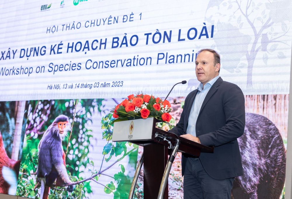 Ông Nick Cox, Giám đốc Hợp phần Bảo tồn Đa dạng Sinh học chia sẻ về tái hoang dã tại một hội thảo về bảo tồn