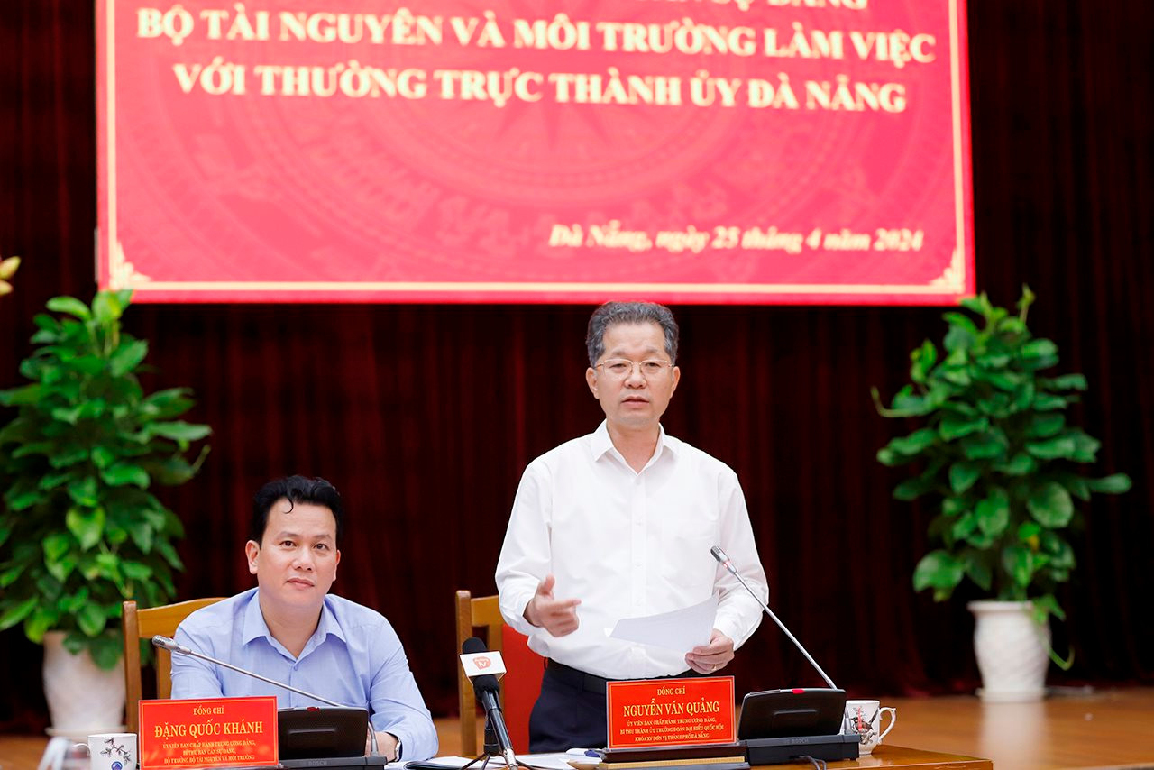Ghi nhận sự quan tâm, hỗ trợ của cá nhân Bộ trưởng Đặng Quốc Khánh, các Thứ trưởng Trần Quý Kiên, Thứ trưởng Lê Minh Ngân cũng như các cơ quan chuyên môn của Bộ Tài nguyên và Môi trường, Bí thư thành phố Đà Nẵng Nguyễn Văn Quảng mong muốn trong thời gian tới sẽ nhận được nhiều sự hỗ trợ, đồng hành của Bộ TN&MT để Đà Nẵng hoàn thành được các mục tiêu phát triển kinh tế - xã hội và bảo vệ môi trường. Thời gian tới, Bí thư Nguyễn Văn Quảng đề nghị Sở Tài nguyên và Môi trường phối hợp với các sở, ngành của Đà Nẵng chuẩn bị nội dung, cơ sở vật chất cho việc tập huấn Luật Đất đai 2024. Sắp tới Bộ Chính trị sẽ có những tháo gỡ về những vướng mắc cho các địa phương để thực hiện các mục tiêu phát triển, trong đó có nhiều nội dung liên quan đến lĩnh vực tài nguyên và môi trường, Bí thư Nguyễn Văn Quảng mong muốn Bộ TN&MT sẽ quan tâm hơn nữa để hỗ trợ thành phố; đồng thời ủng hộ các chủ trương, chính sách của Đà Nẵng đang trình Chính phủ, Quốc hội. Bí thư Nguyễn Văn Quảng khẳng định Đà Nẵng sẽ xung phong và tập trung các nguồn lực ưu tiên cho các đề án bảo vệ môi trường, phân loại, thu gom rác thải, nước thải để đưa Đà Nẵng là địa phương phát triển bền vững, xanh, sạch, đẹp nhất Việt Nam.